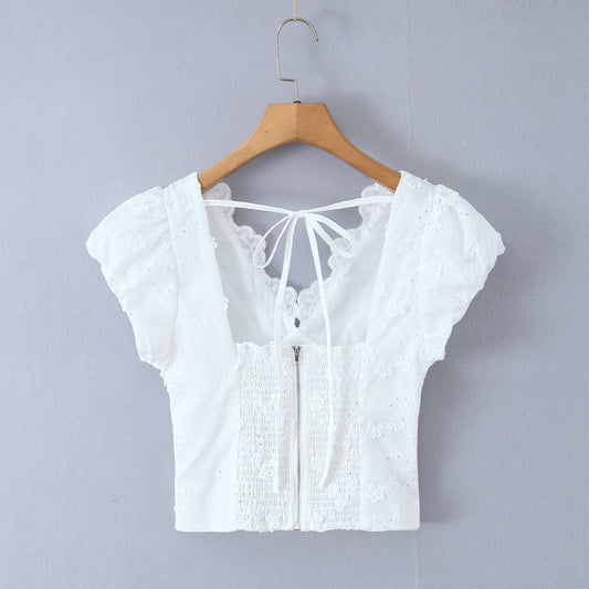 3D Jacquard Back Zipper Bubble Sleeve V-neck Small Top