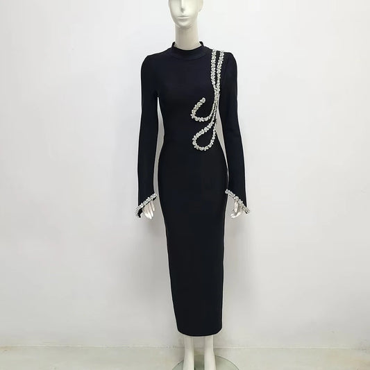 Black Color Women Long Sleeve Shinning Crystal Bodycon Bandage Long Dress Fashion Celebrate Evening Party Cocktail Dress
