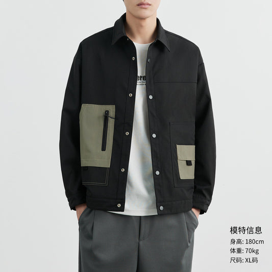 Anti-wrinkle Twill Men's Black Flip Collar Jacket, Trendy Slightly Loose Patchwork Workwear Casual Coat