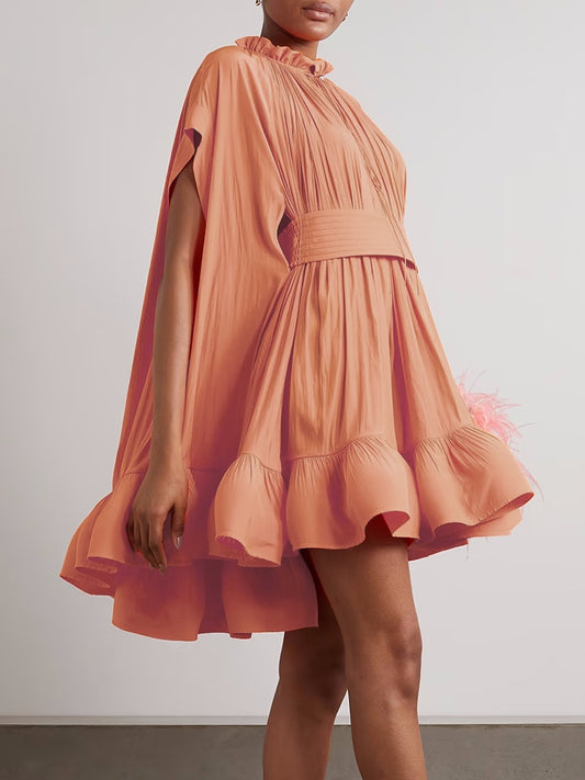 Asymmetrical Solid Mini Dresses For Women Round Neck Short Sleeve High Waist Spliced Plieasted A Line Dress Female Summer