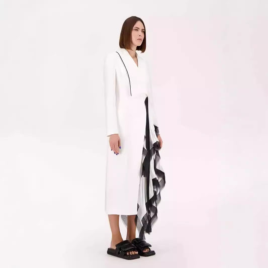 Asymmetric pleated loose mouth ruffle edge contrasting long suit jacket for women