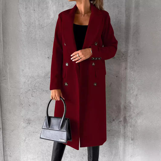 Women's Spring Fashion Wool CoatSolid Color Long Sleeve Double-Breasted Patch Pocket Versatile Outerwear