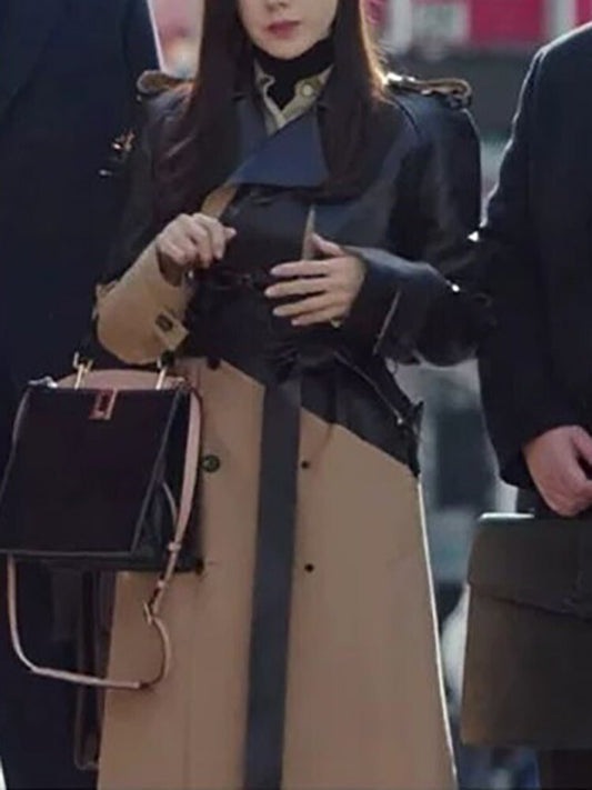 Women's Trench Coat Spliced Pu Leather Lapel Double Braested Lace Up Waist Long Sleeve Windbreaker