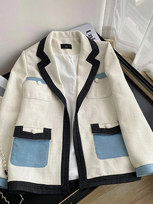 Women's Tweed Blazer Contrast Color Notched Collar Denim Pockets Loose Elegant Suit Jackets Autumn New Fashion