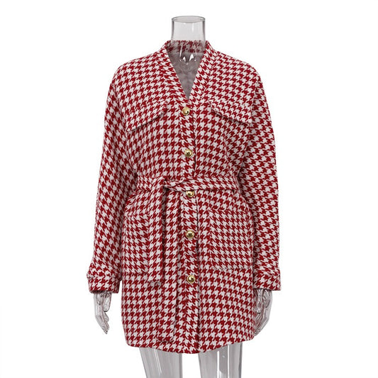 Xiaoxiangfeng set women's Qianniao grid lace up jacket hip hugging skirt two-piece set