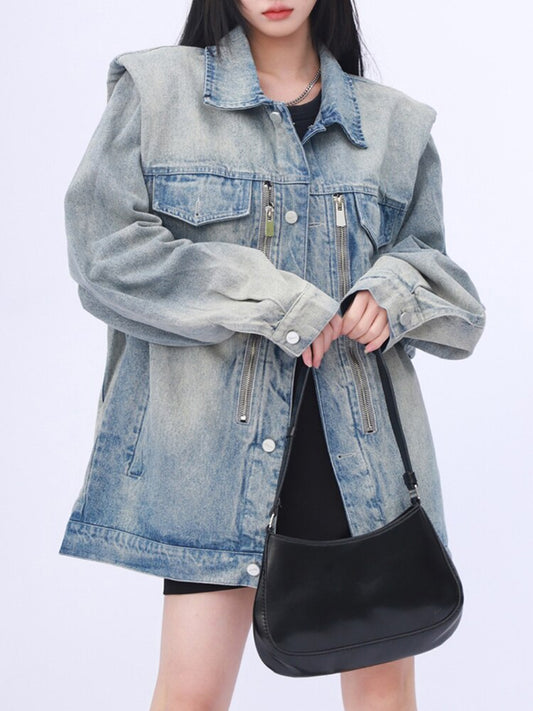 [EAM] Loose Fit Blue Denim Big Size Casual Jacket New Lapel Long Sleeve Women Coat Fashion Tide Spring Autumn 1DF6799