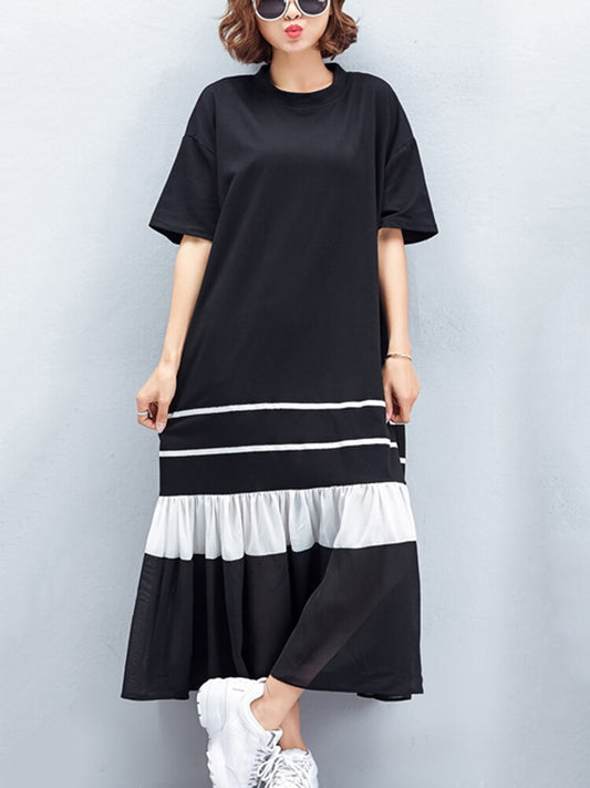 [EWQ] Women Black White T-shirt Dress Big Size Loose Short Sleeve Hem Gauze Patchwork O-neck Dresses Summer New Tide Robe