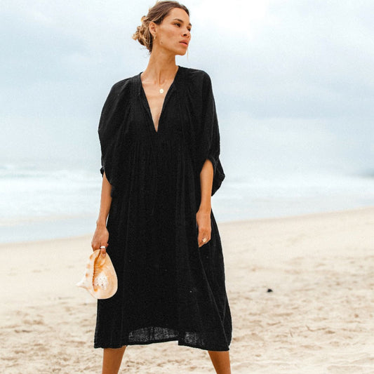 Autumn New Large Size Loose Long Sleeve Lantern Sleeve Casual Retro Solid Color Long Dress