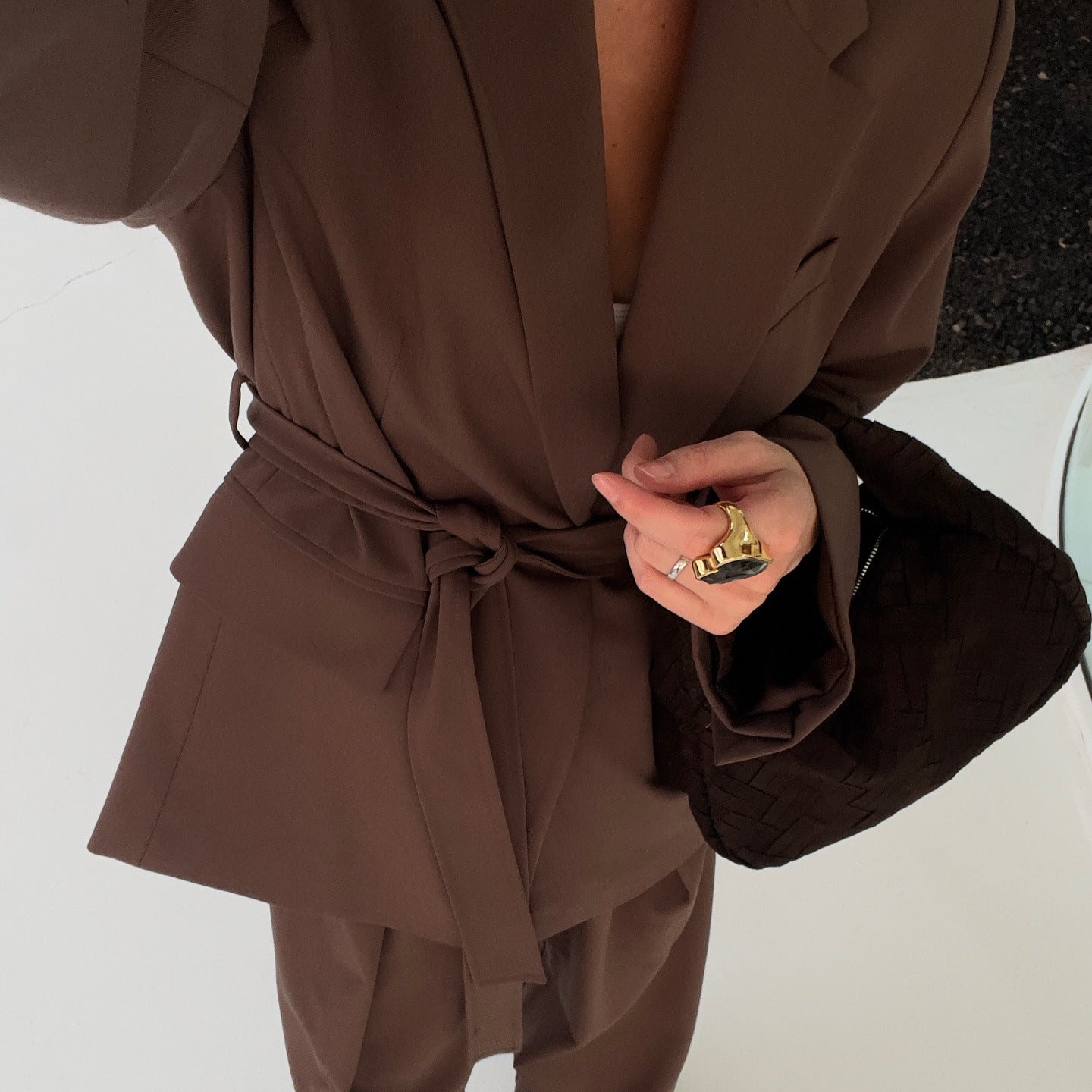 Belted Loose Casual Suit Jacket Pants Set for Women