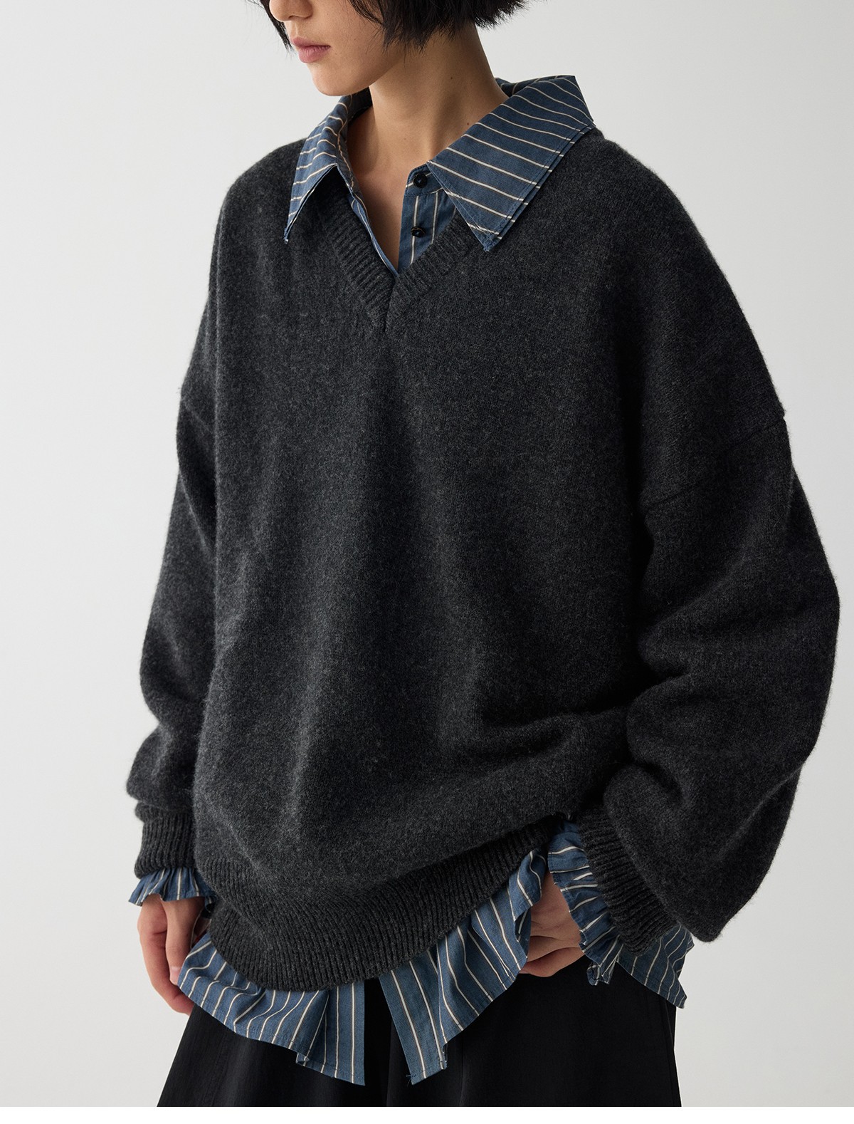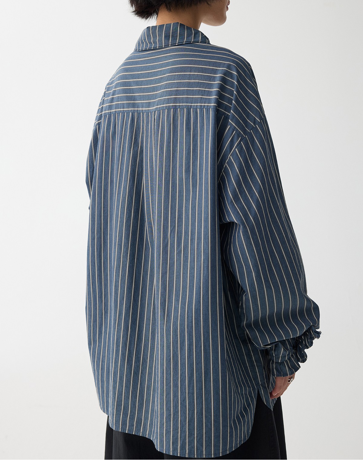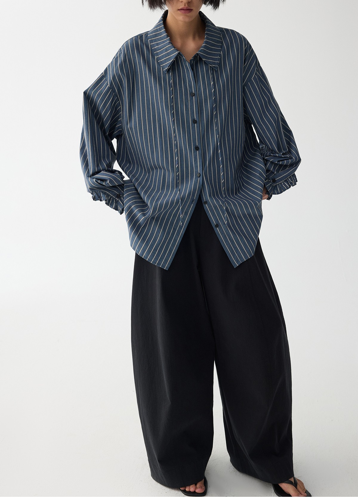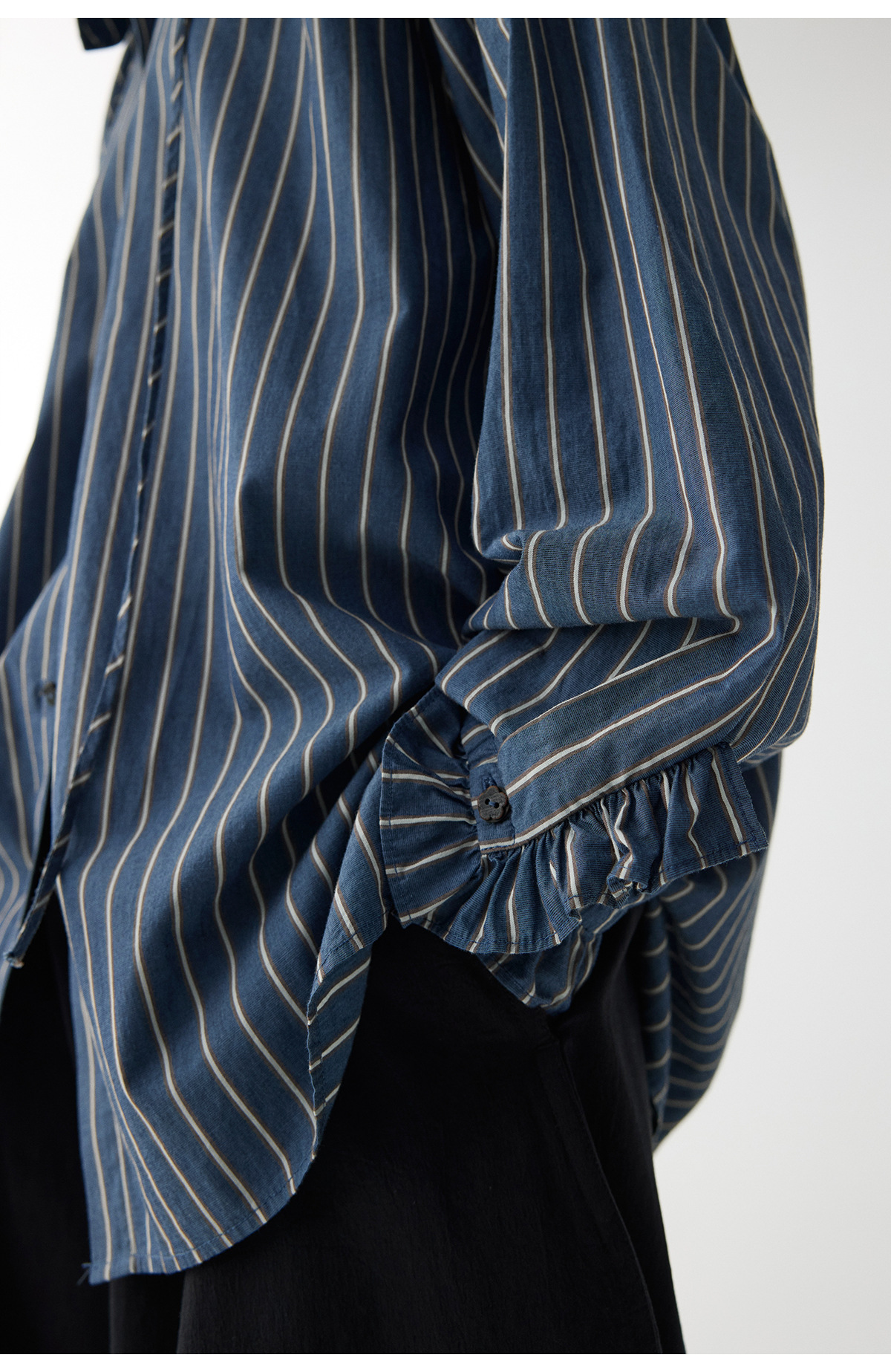 HAVERICE饭馆 蔚蓝梦境 色织深蓝条纹双层领子系带衬衫衬衣上衣